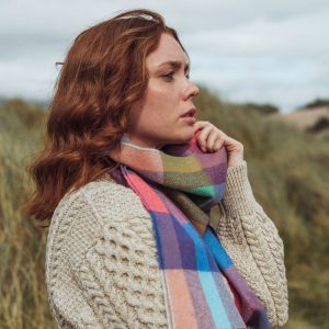 Lambswool Cape Cream Taupe and Denim Check. Soft, warm and effortlessly stylish, the John Hanly Lambswool Cape is a versatile layer for any season. Woven from 100% pure lambswool in our Tipperary mill, it combines cosy comfort with a contemporary drape. Designed in a one-size-fits-all silhouette, it flatters every shape and adds an elegant finish to both casual and dressy looks. The popular Sue style comes without a fringe for a clean, modern edge, while the rich checks and colours bring timeless Irish charm to your wardrobe.