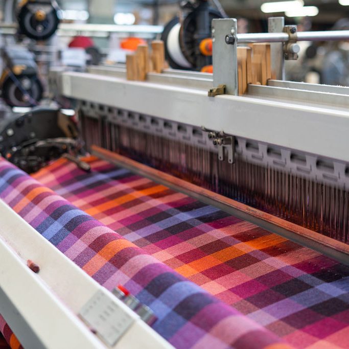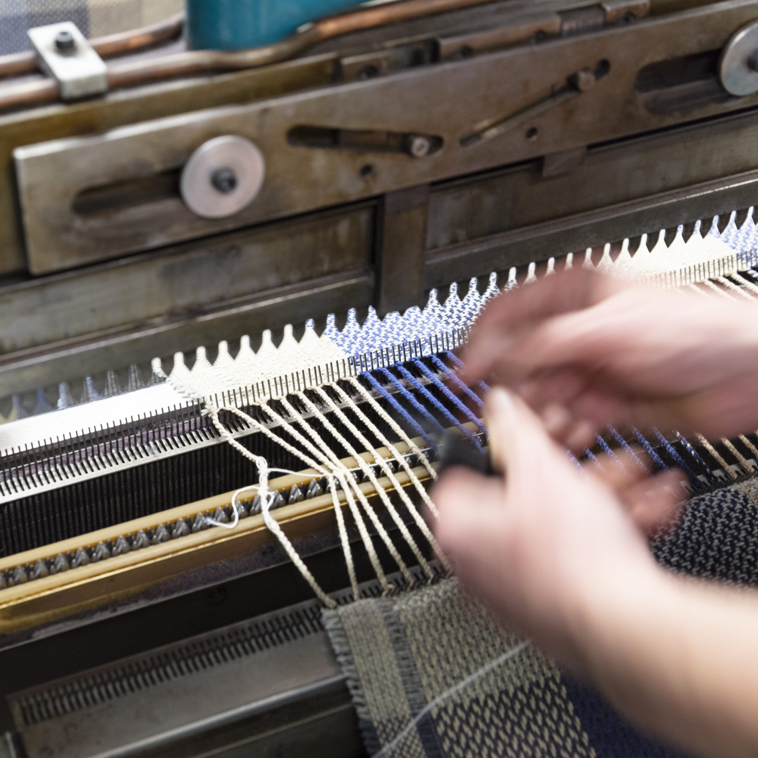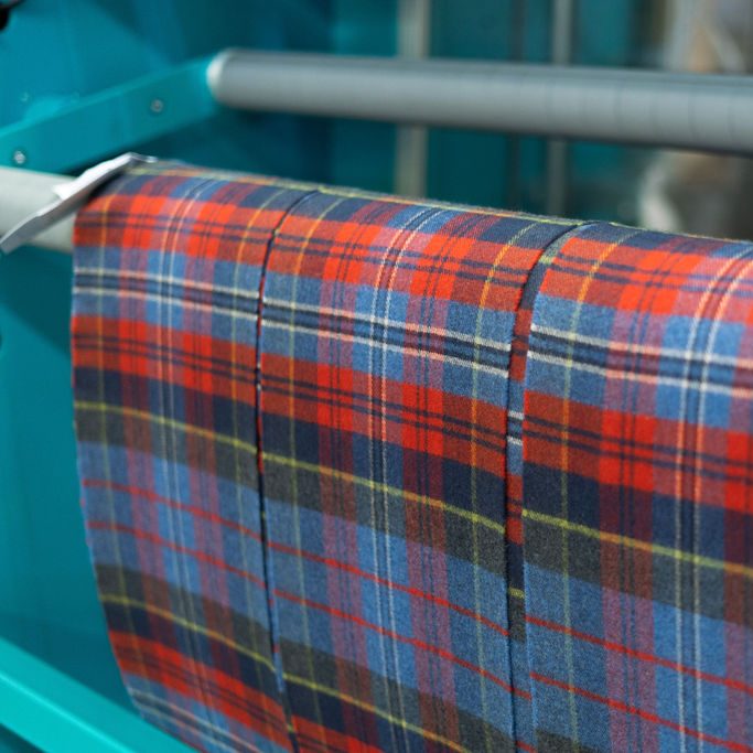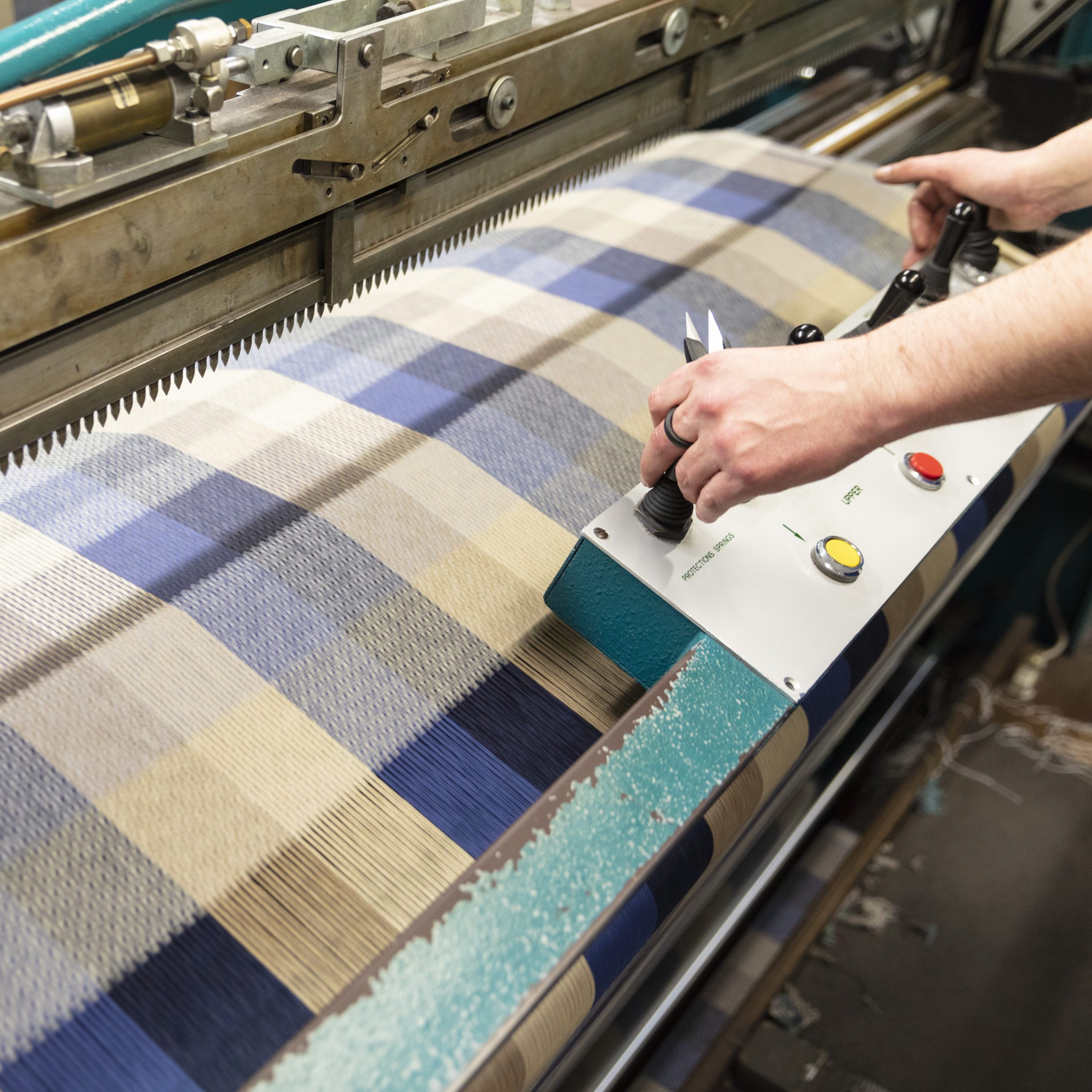 Once the warp is set, it’s time to weave. Our state-of-the-art looms — guided by experienced weavers — intertwine the warp and weft yarns to bring the design to life. The rhythmic motion of the looms fills our historic mill with a steady hum, a sound that has echoed through generations. This is where texture, pattern, and structure merge — transforming fine yarns into the soft, tactile beauty of a woven throw.