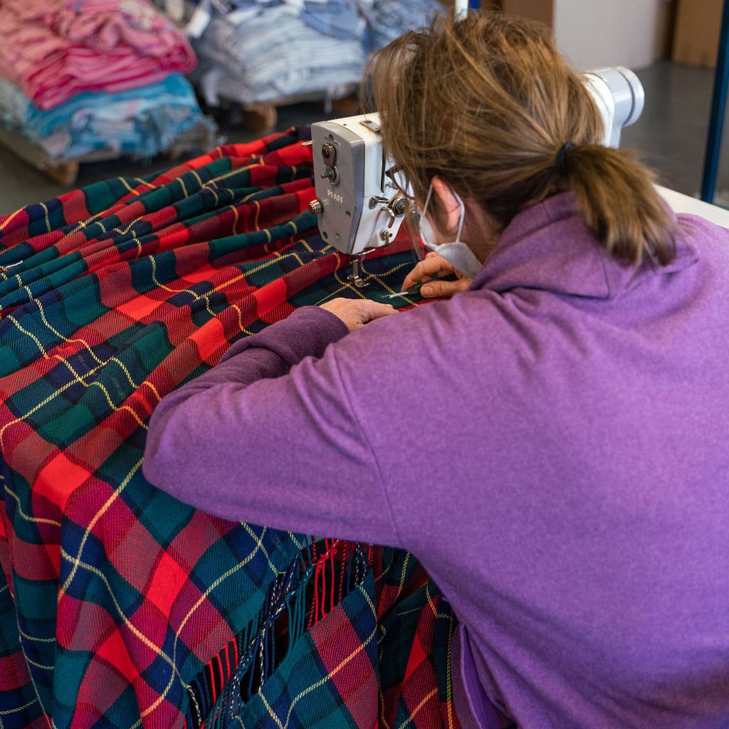 After weaving, the fabric moves to fringing, where the loose ends are carefully twisted and knotted. Using specialised fringing machines, each edge is given a consistent, elegant finish — one that enhances both the look and feel of the final product. It’s a small detail that makes a world of difference, adding that classic John Hanly touch.