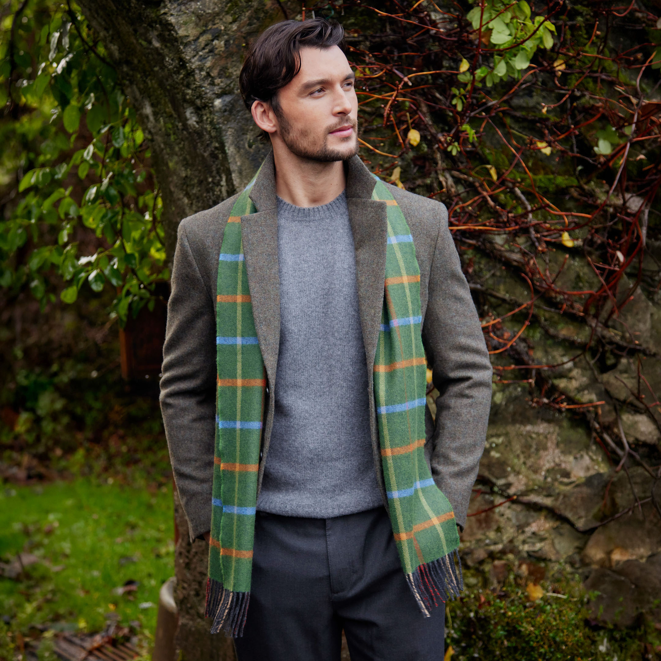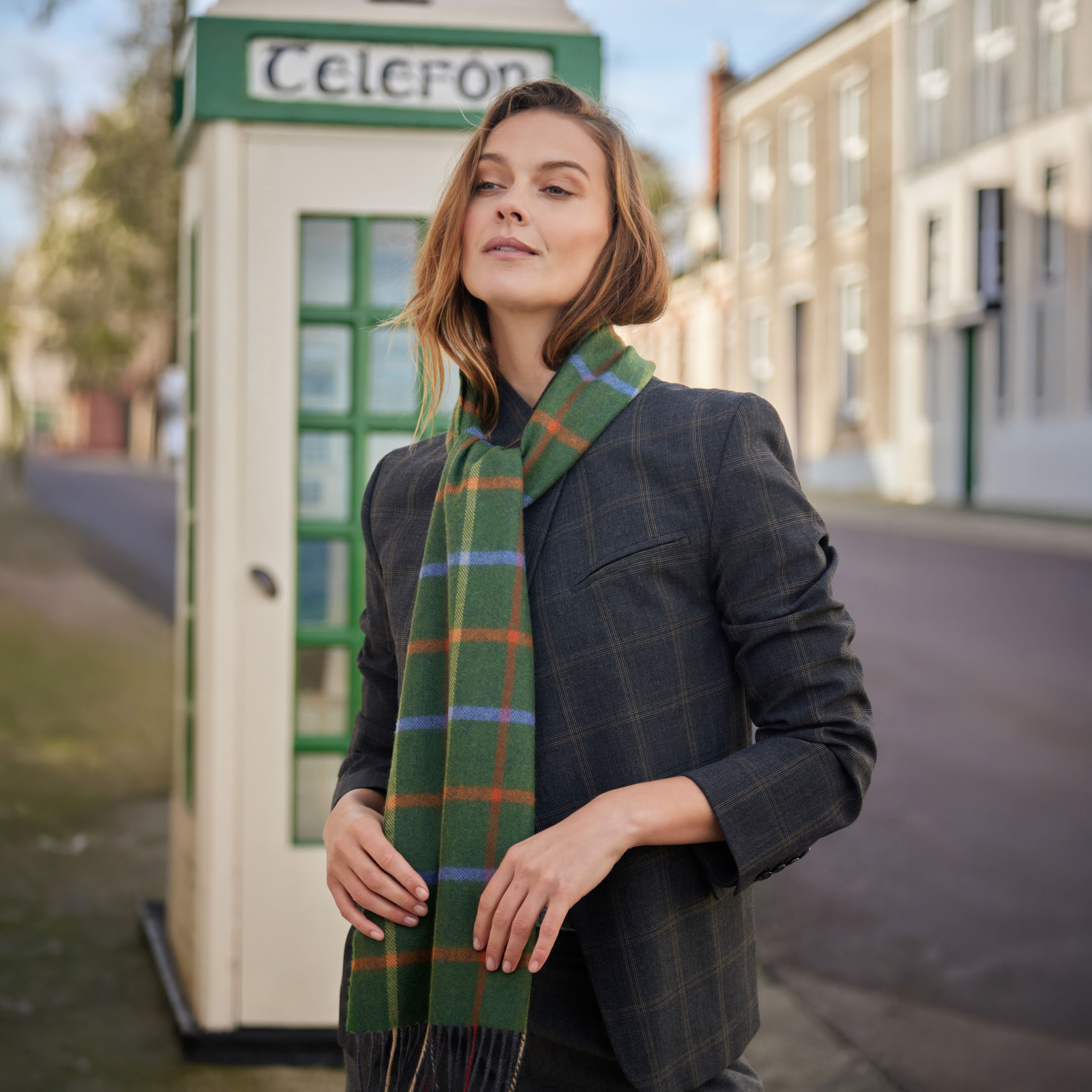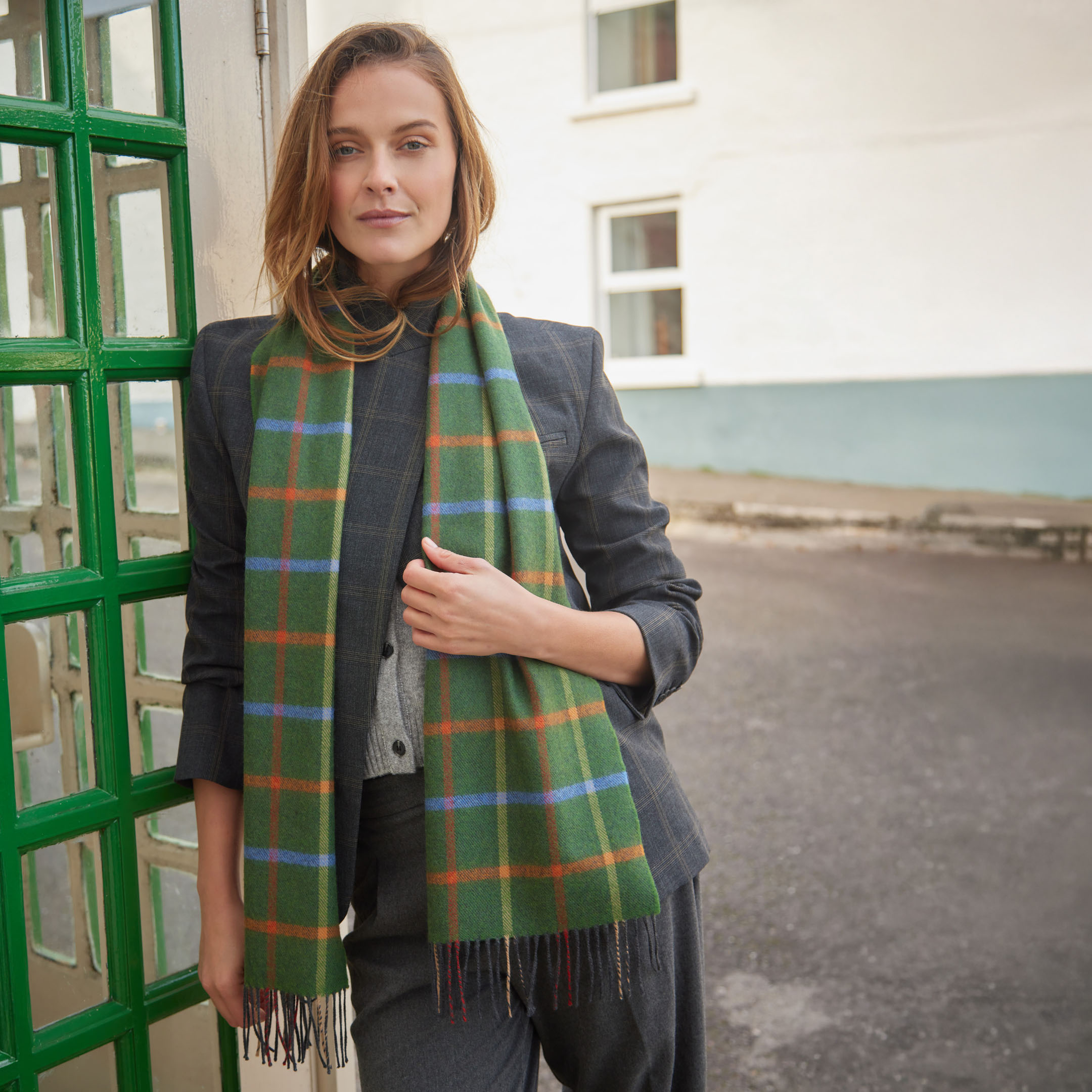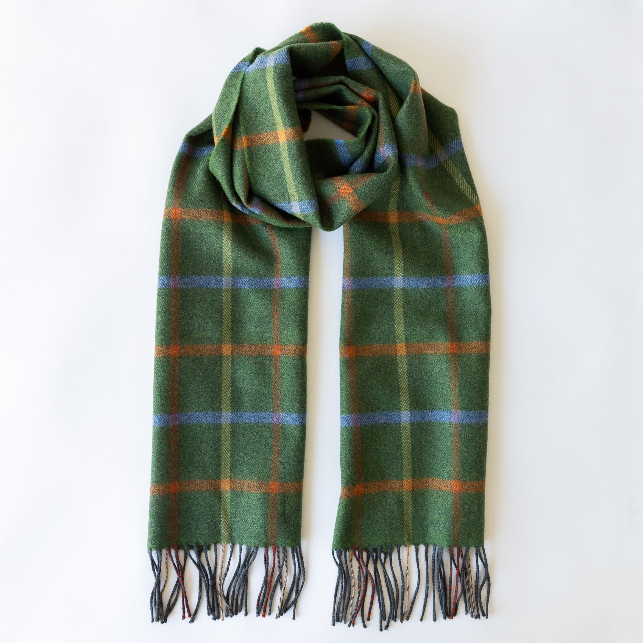 811 – Merino Luxury Wool Scarf Green Rust Orange Blue Check