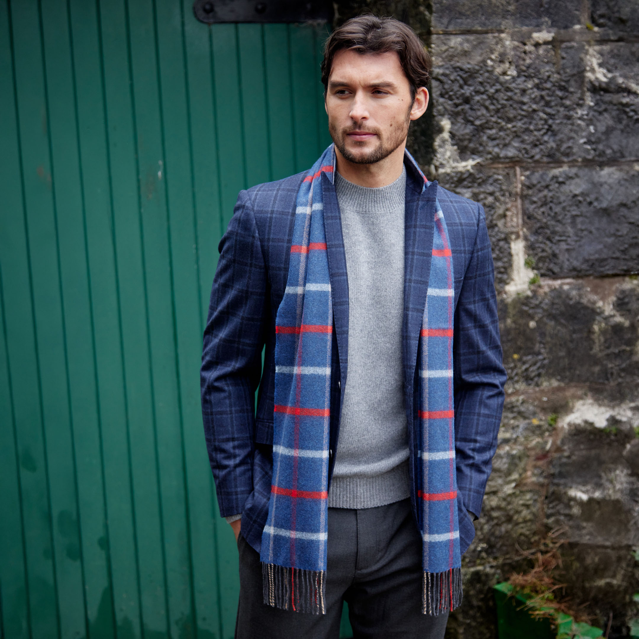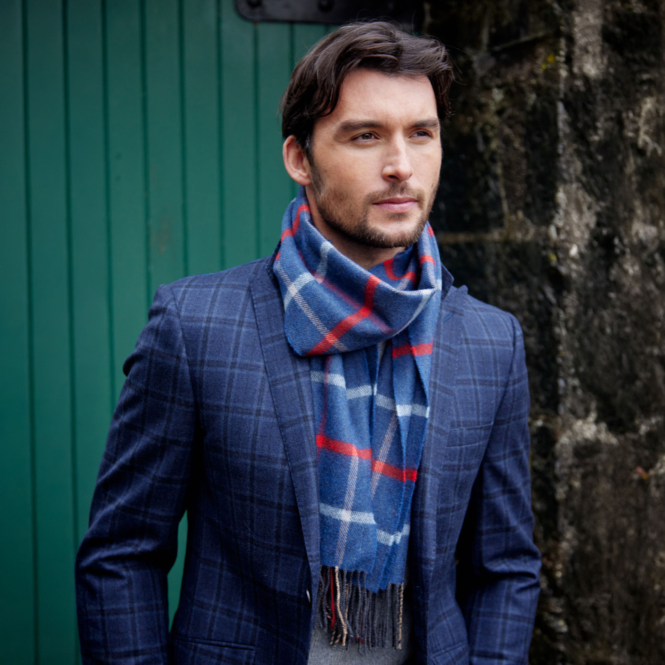 812 – Merino Luxury Wool Scarf Blue Red Sky Beige Check