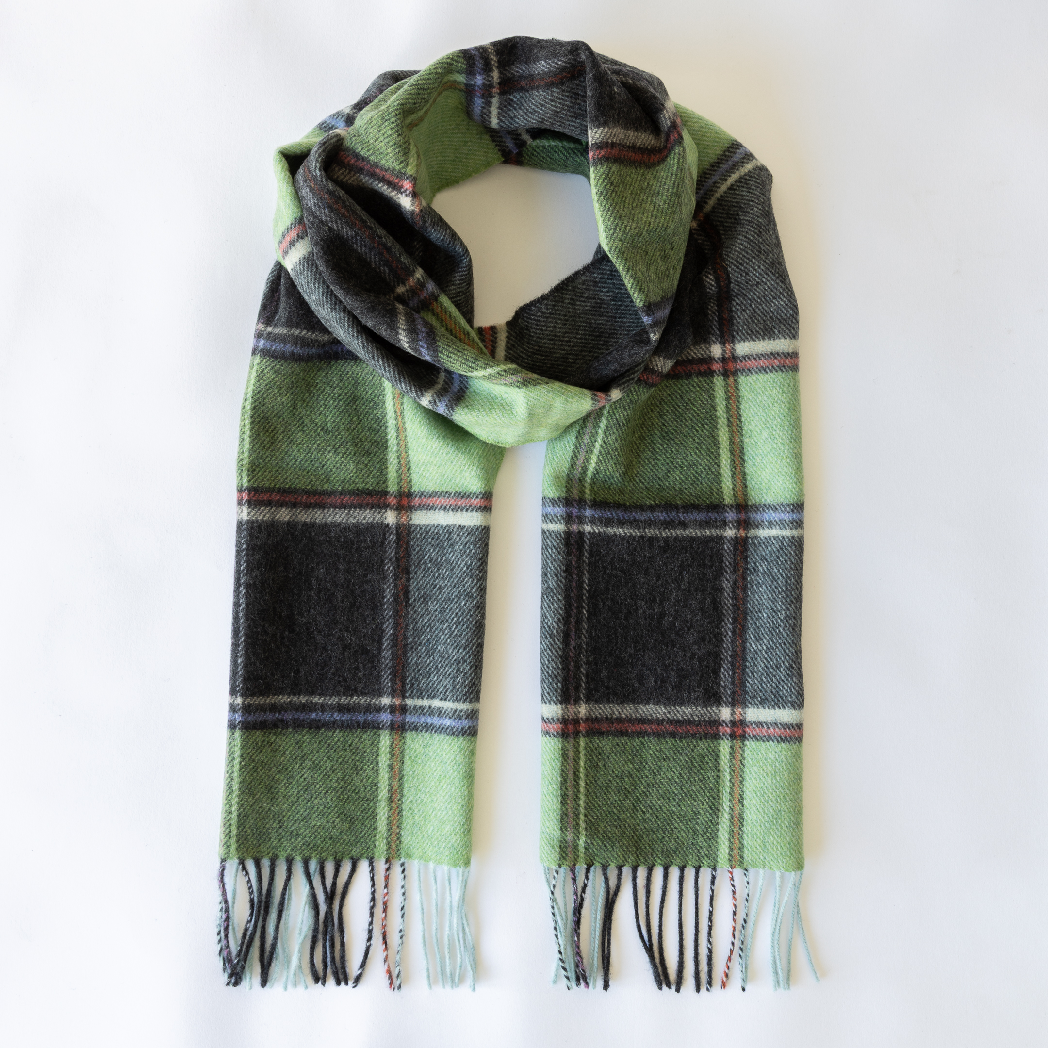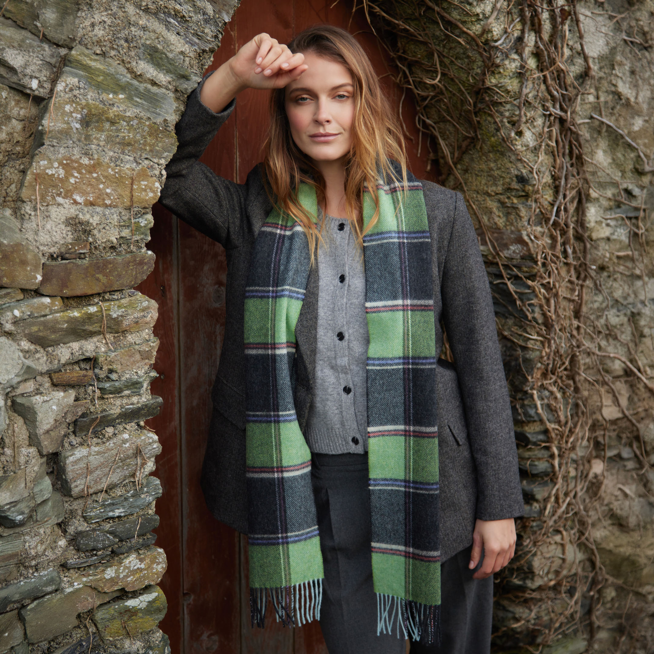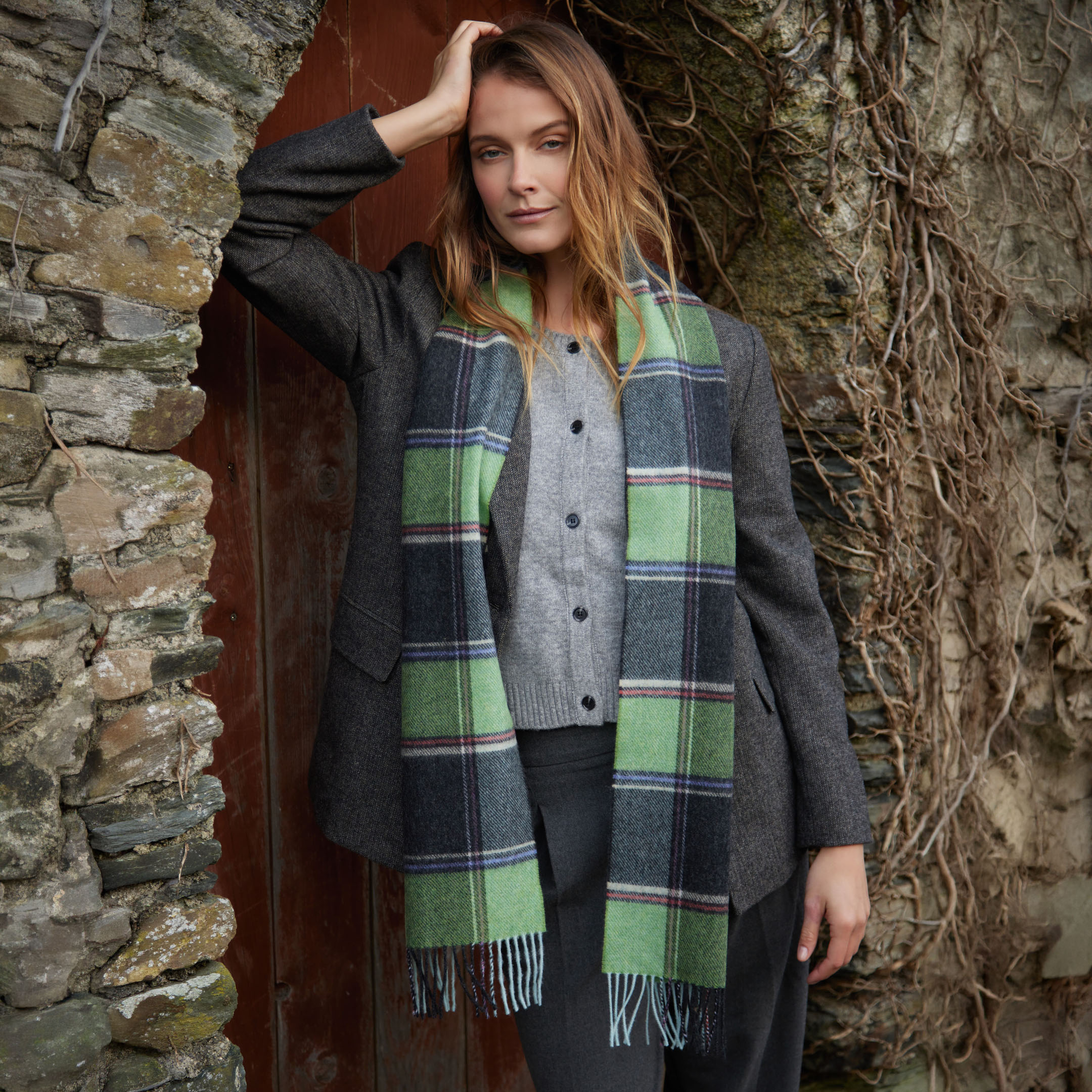 1913 – Irish Wool Scarf Long Green Charcoal Multi Block Check