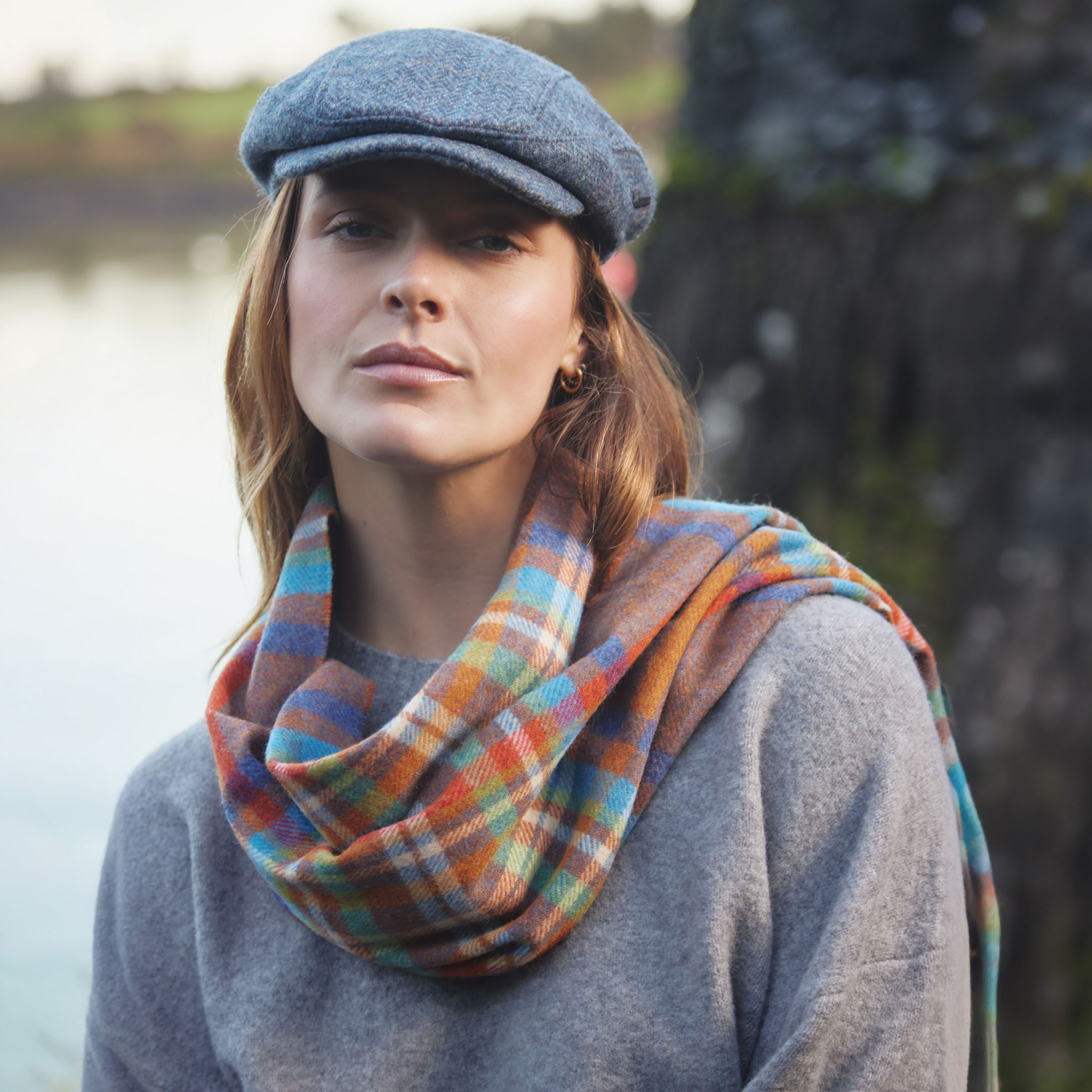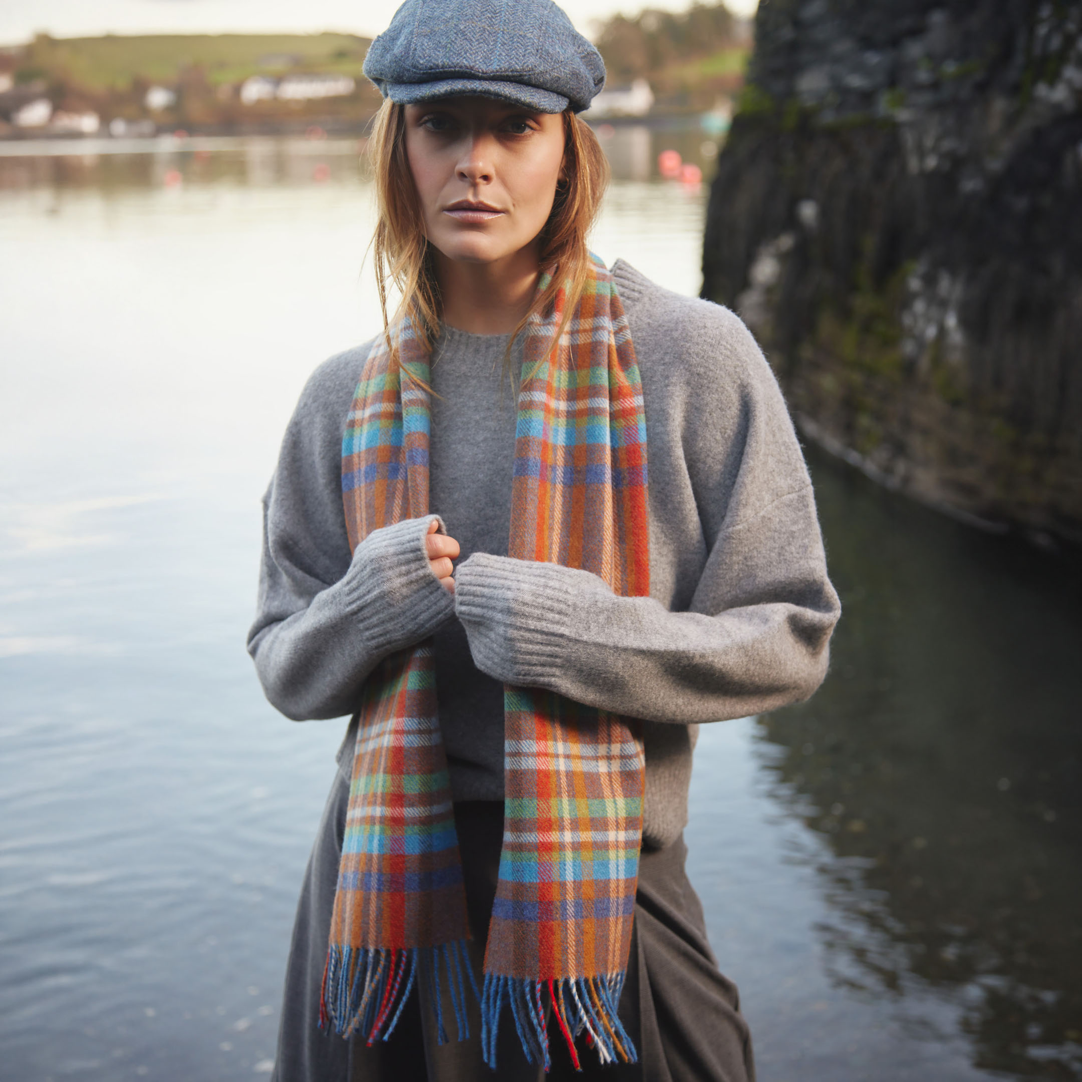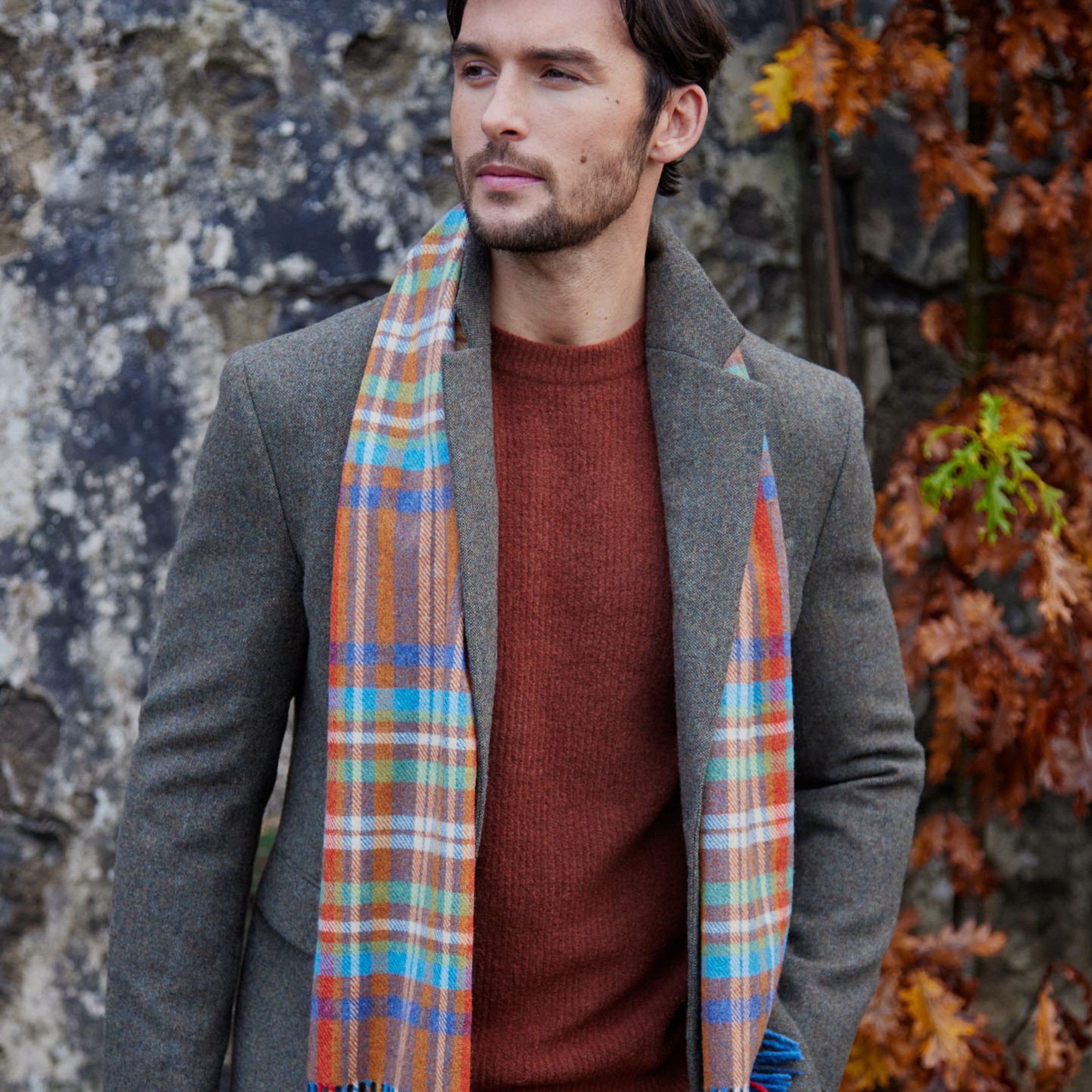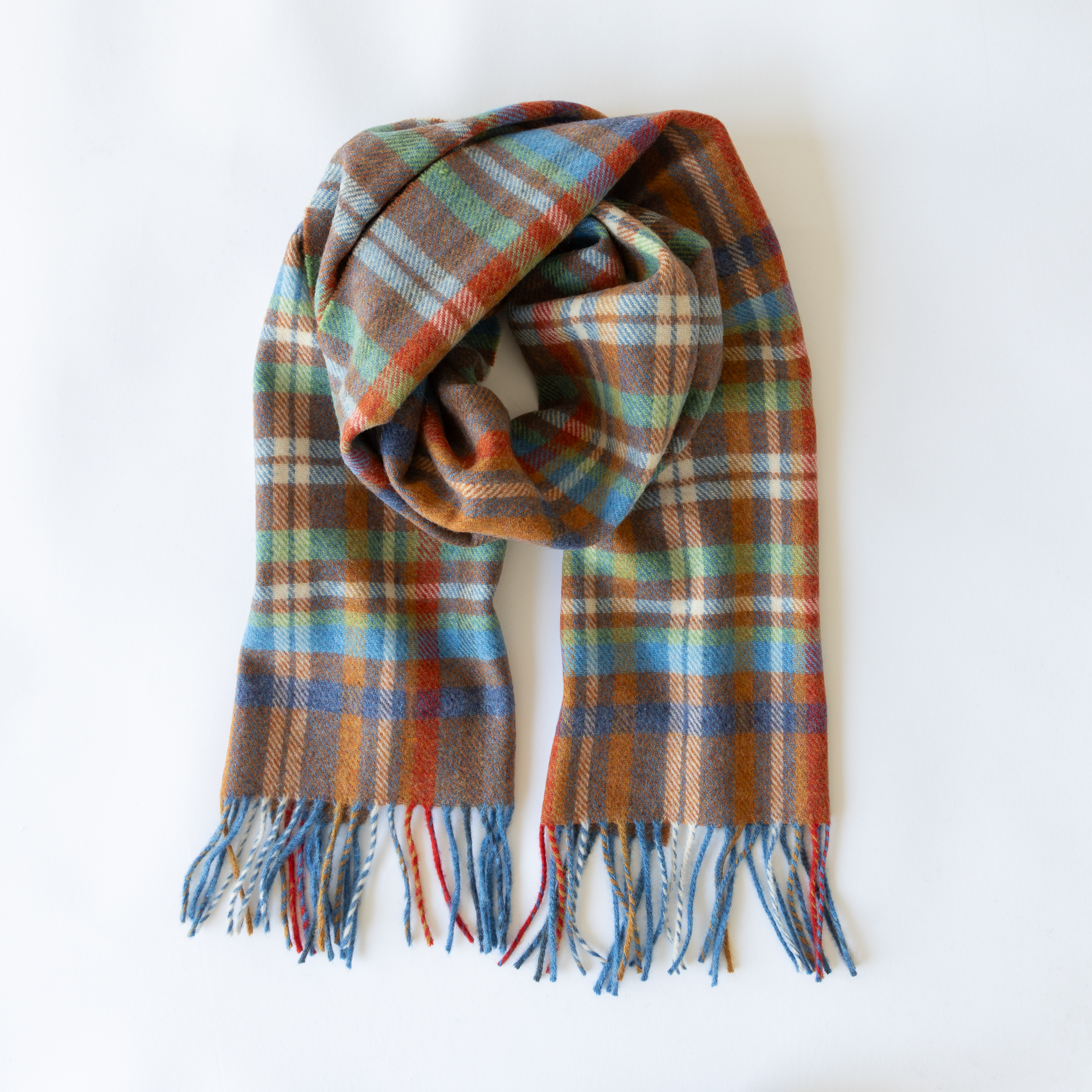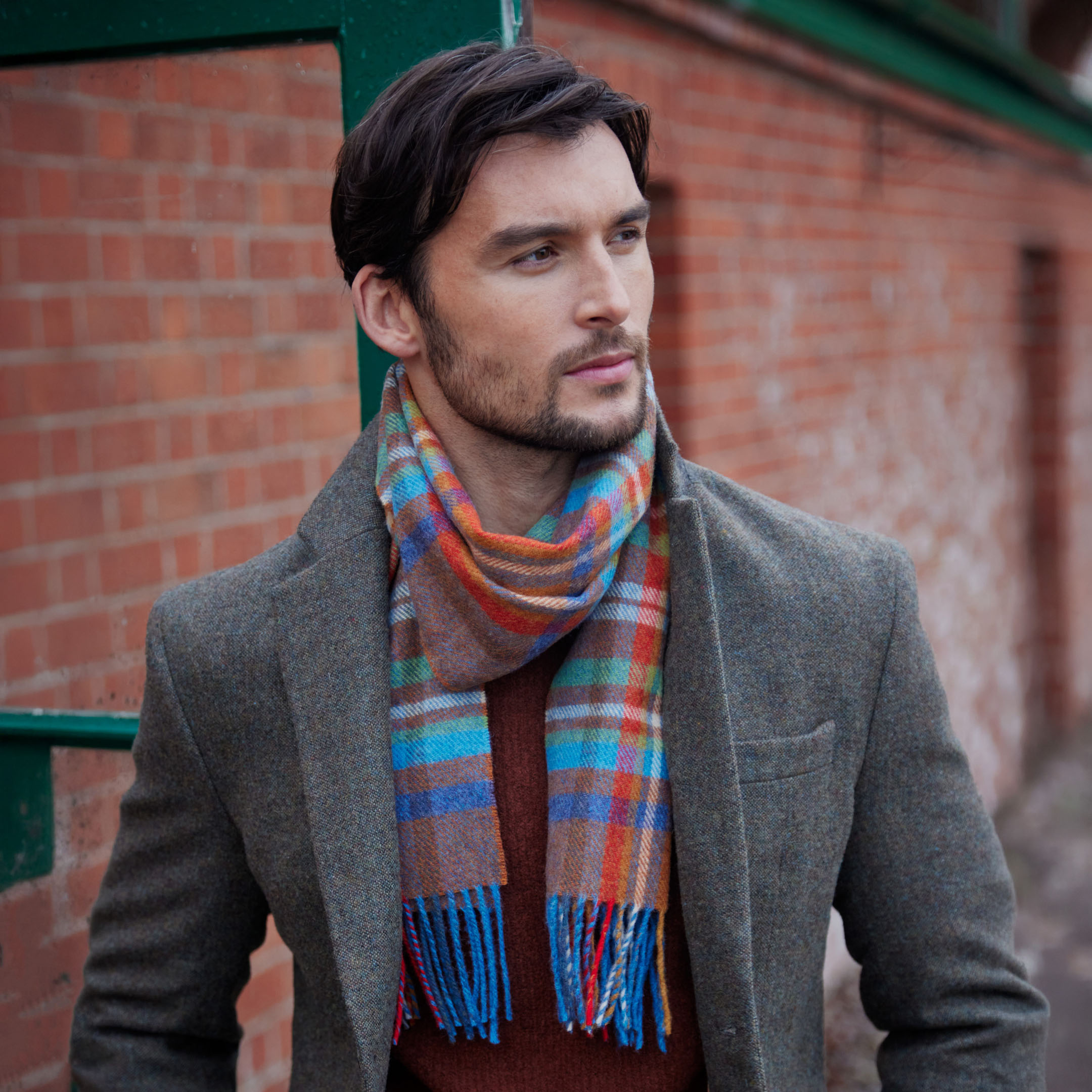 226 – Irish Wool Scarf Short Rust Orange Blue Green Check
