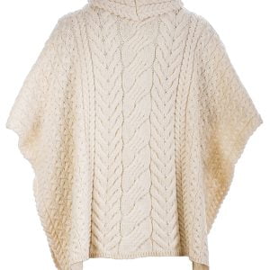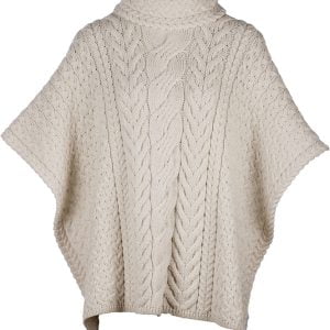 A longer length, oversized rectangular poncho with cowl neck. Fitting below the hips, this cocooning Aran poncho features chunky 4 finger cables, flanked by mirrored cables which reduce in size across the poncho, finishing with panels of cable trellis which complement the chunkier cables. The edges are finished with mirrored cables which are echoed at the neck edge, giving a lovely, scalloped detail. The bottom is finished in 1×1 rib. Knitted in 5 gauge Supersoft Merino, this poncho is a generous fit and longer length, sitting below the hip. One size.