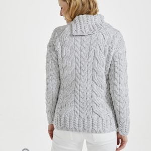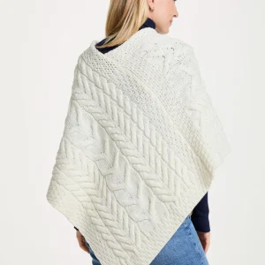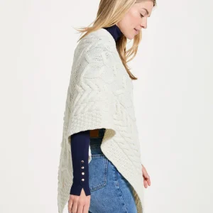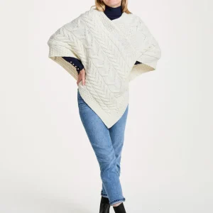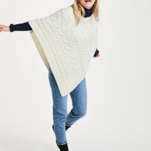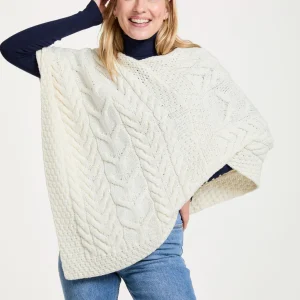 A classic shaped triangular poncho in a two-colour herringbone pattern throughout, with relaxed cowl neck, fastened at the left shoulder and side with traditional shanked football buttons and finished with a solid colour at the edge. Standard length and one size. Knitted in luxurious 100% Merino, 5 gauge.