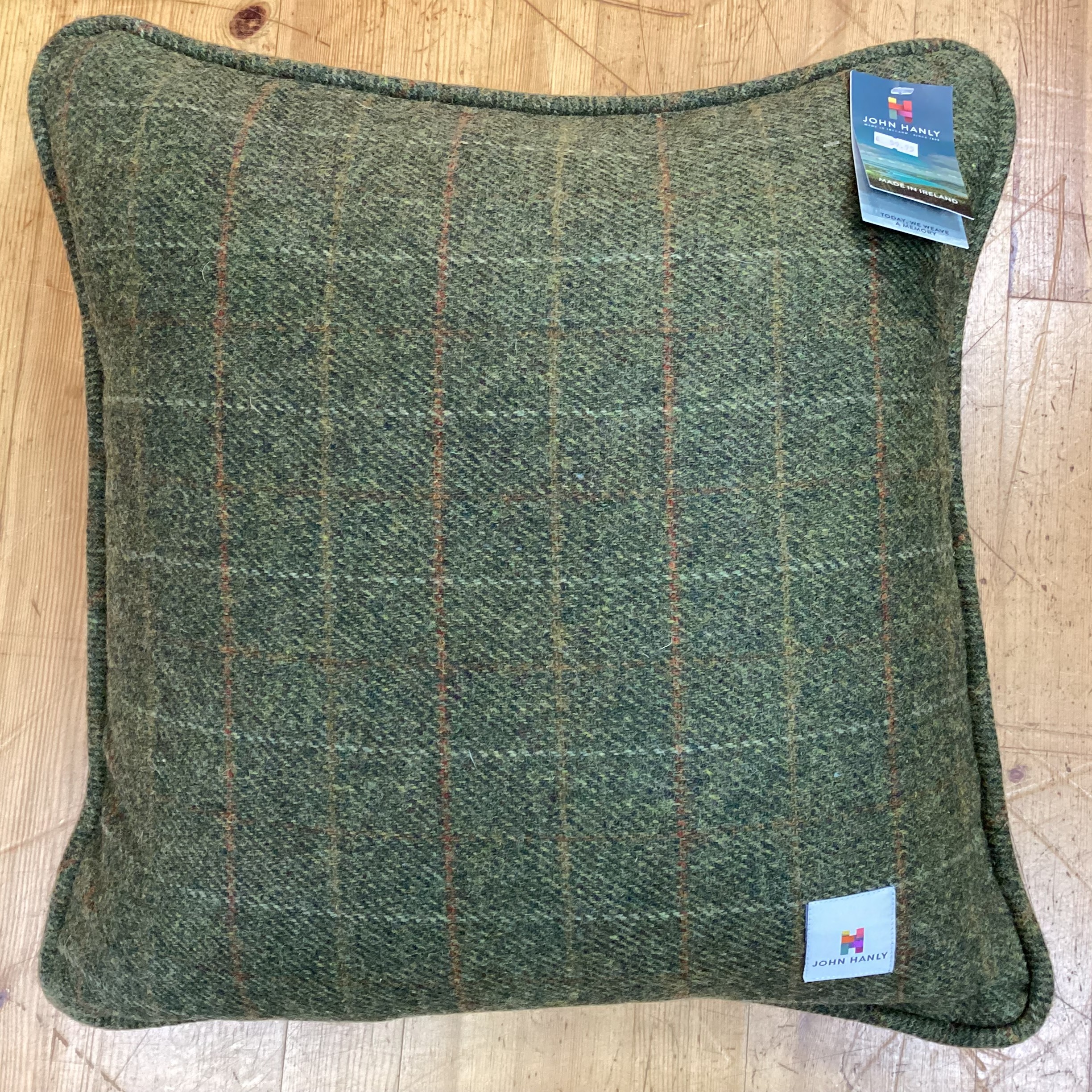 Ballyartella Cushion Green Brown Overcheck. Bring classic Irish warmth and texture into your home with our 100% Pure Wool Cushion. The cover is crafted from 100% Pure Wool, woven for durability and timeless style, while the cushion is filled with plush all-Irish duck feathers encased in a 100% cotton lining for a soft, supportive feel that stays plump over time. Measuring 50 x 50 cm, this cushion pairs effortlessly with any interior, adding subtle pattern and luxurious comfort to sofas, armchairs, or beds. Price includes both the cushion cover and inner.