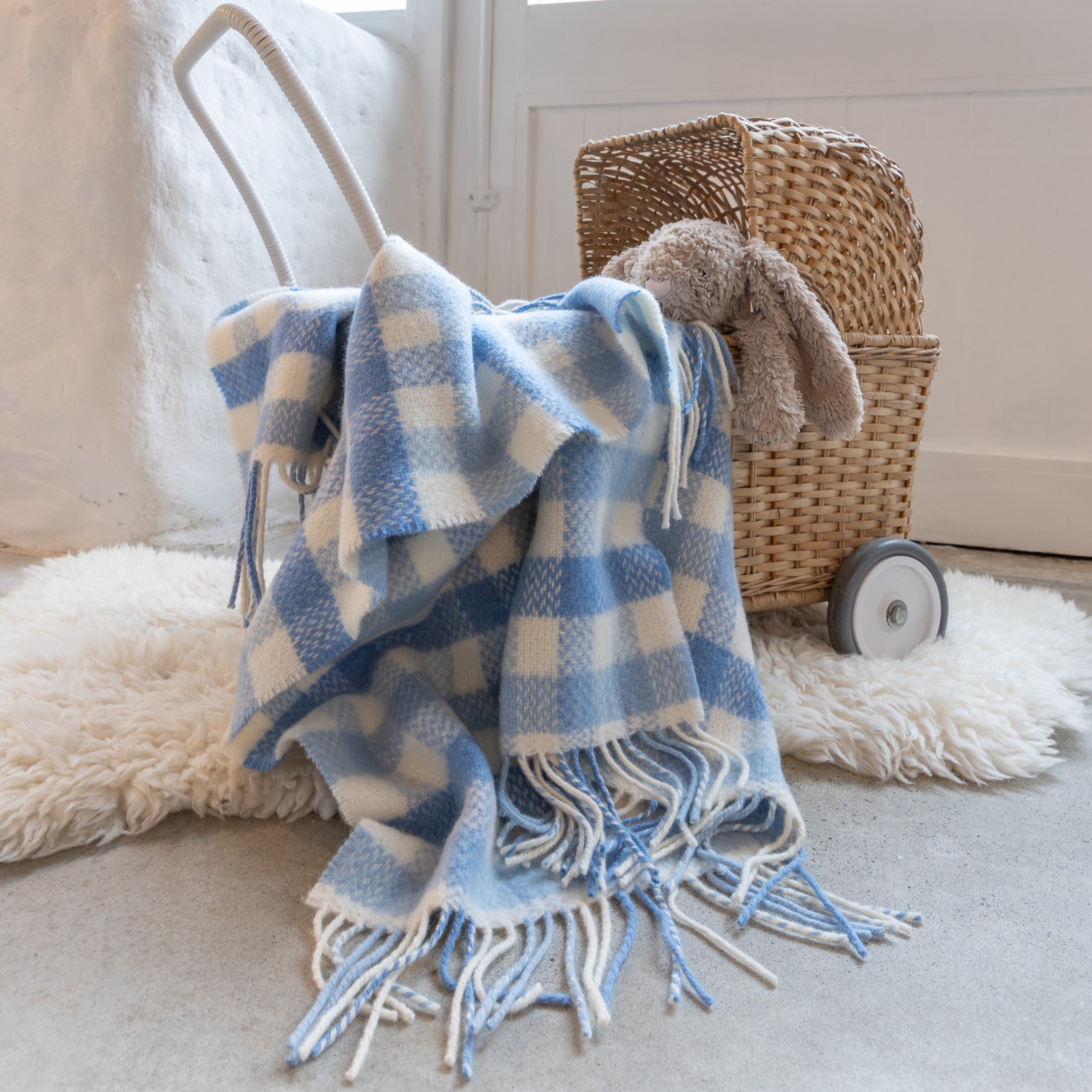 Irish Cashmere Baby Blanket Blue Block Check. Wrap your little one in timeless softness with our Irish Cashmere Baby Blanket. Woven from a luxurious blend of 95% Merino Wool and 5% Cashmere, this blanket is exquisitely gentle on delicate skin while offering lasting warmth and comfort. Designed to become a cherished heirloom, it’s perfect for celebrating baby’s earliest moments and milestones. Each blanket arrives in a specially designed gift box, making it a thoughtful present for new parents or a beautiful addition to your own nursery.