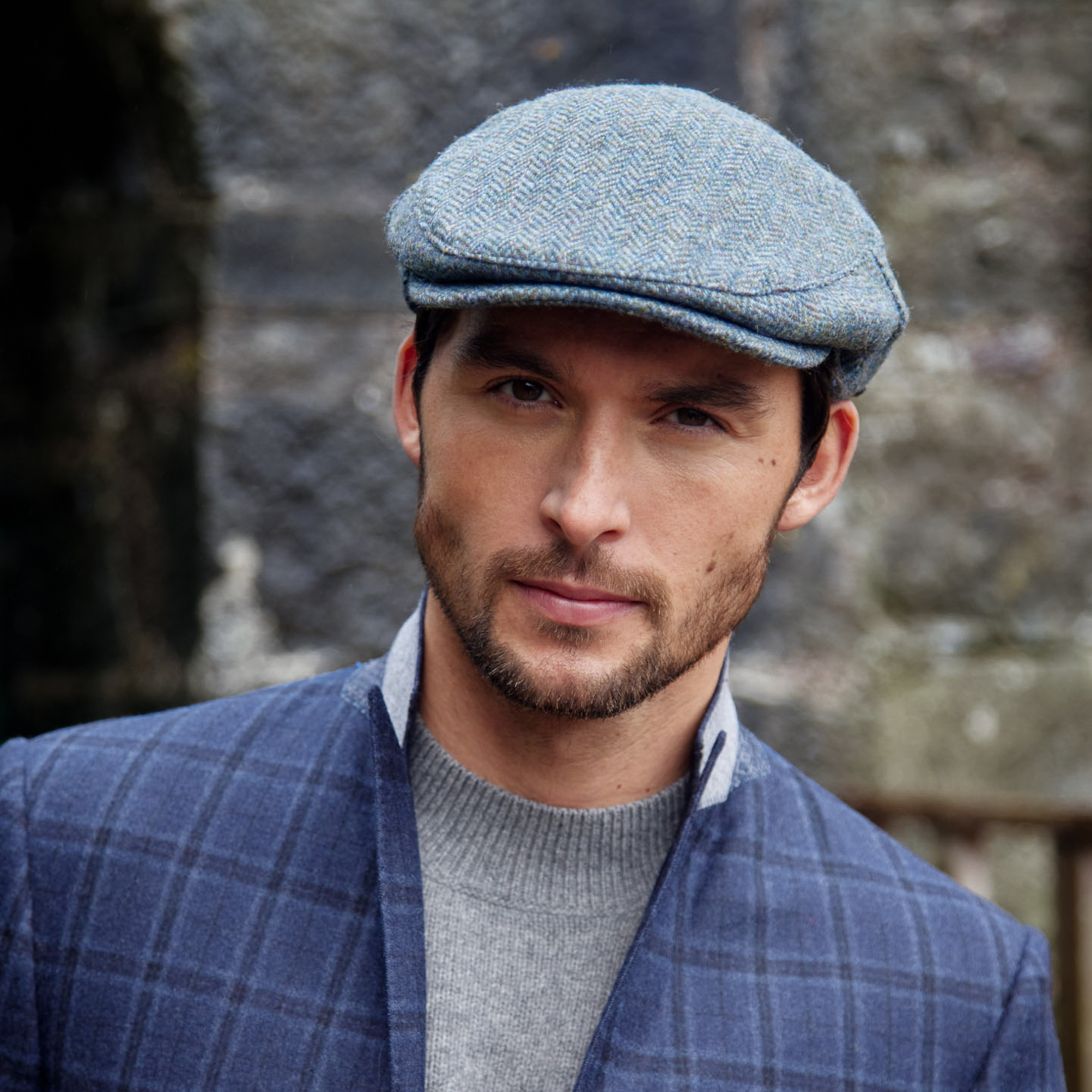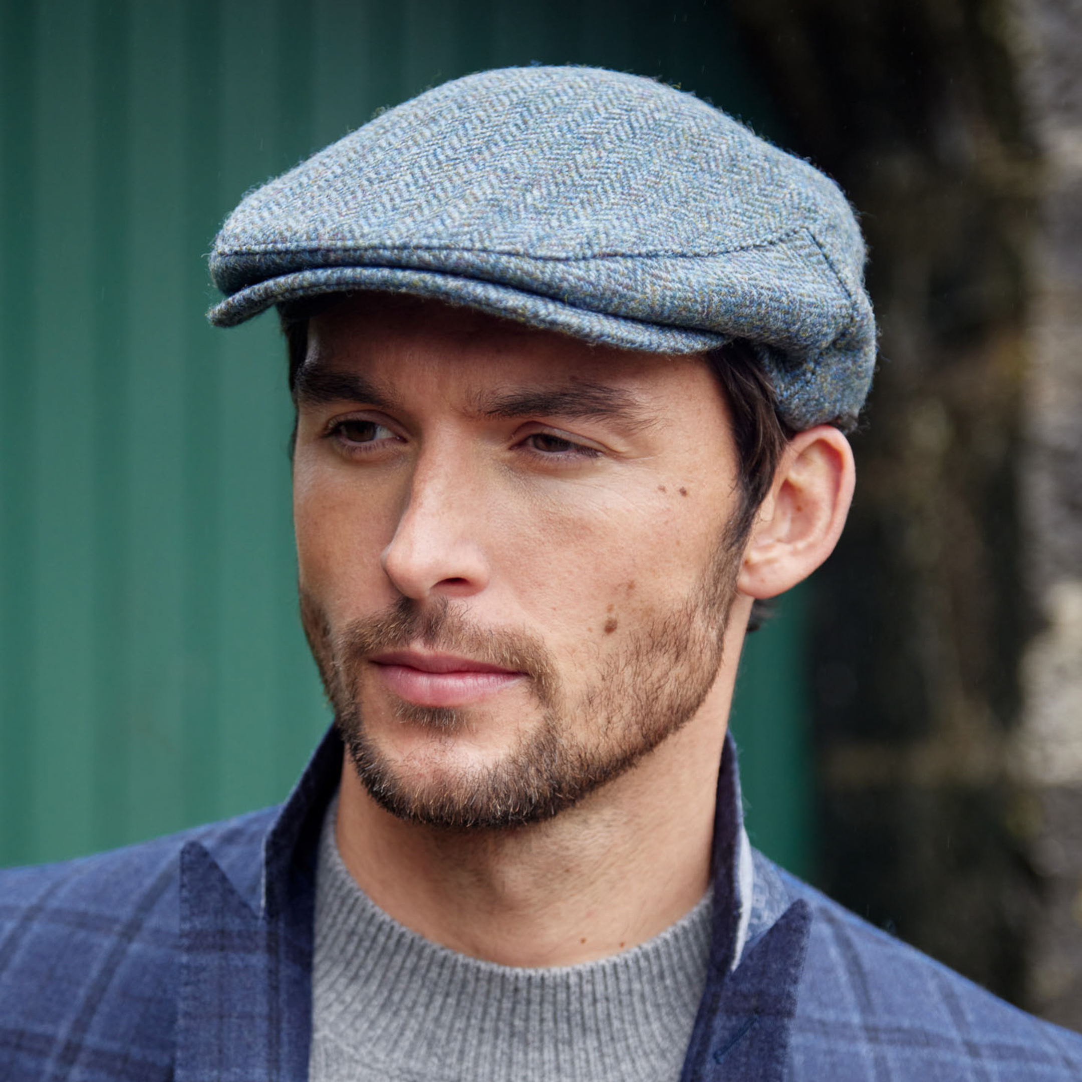 Irish Tweed Cap Mid Blue Green Herringbone