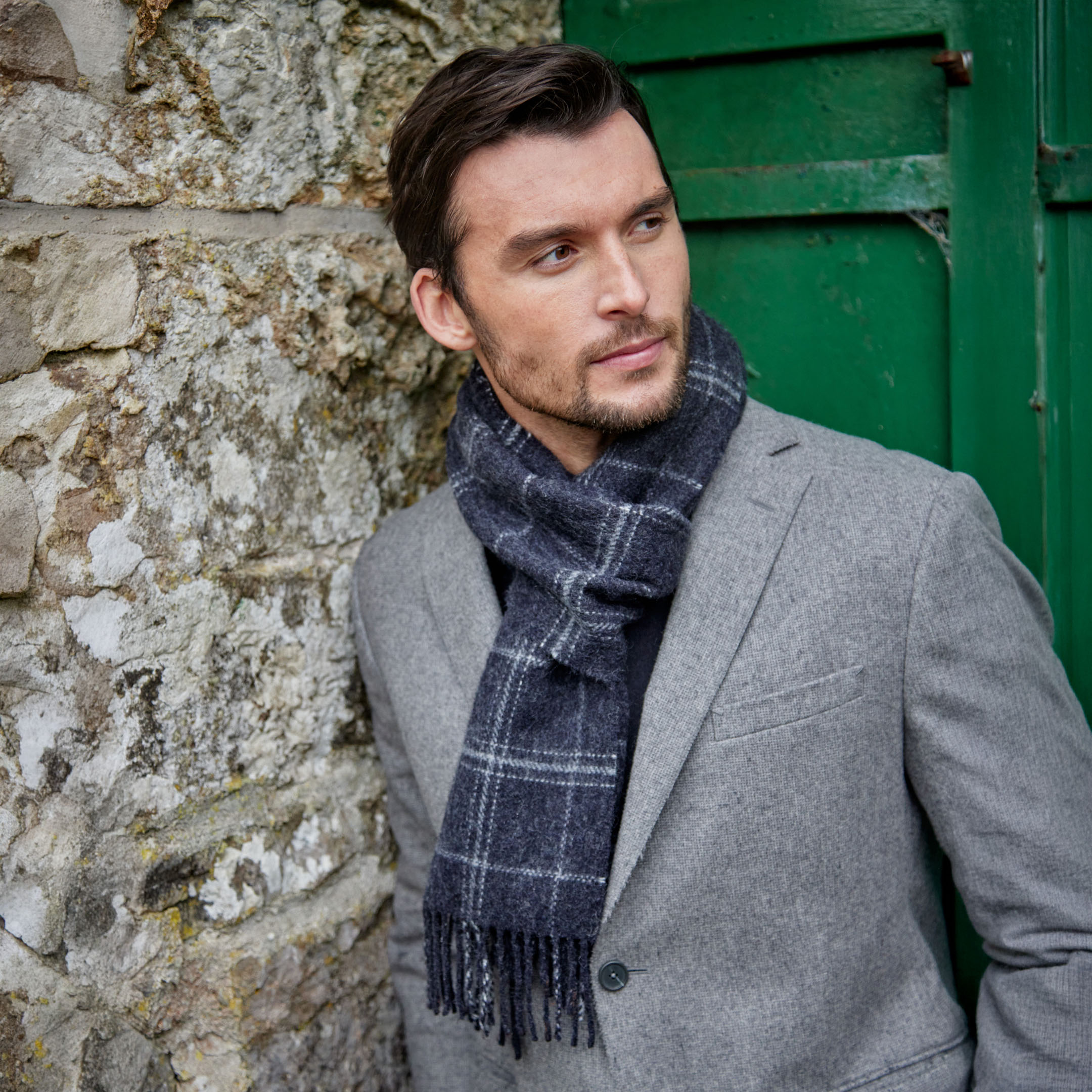 Irish Wool Scarf Long Long Charcoal Grey Check. These 100% lambswool Scarf offer an ideal blend of checks, plaids and stripes for men and women. 100% Lambswool.