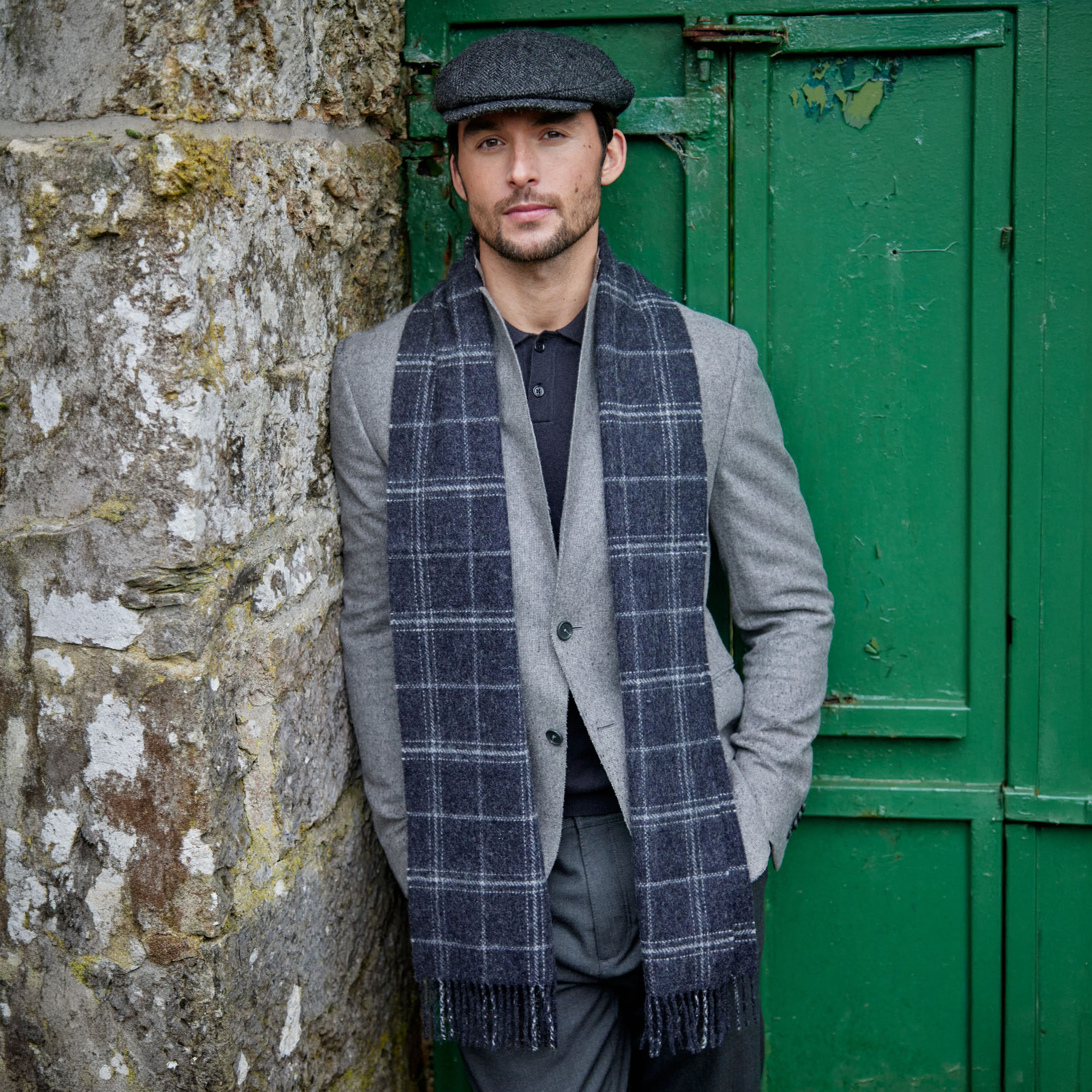 Irish Wool Scarf Long Charcoal Grey Check