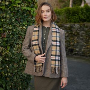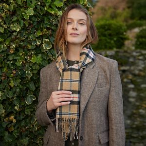 Lambswool Cape Grey Pink. Soft, warm and effortlessly stylish, the John Hanly Lambswool Cape is a versatile layer for any season. Woven from 100% pure lambswool in our Tipperary mill, it combines cosy comfort with a contemporary drape. Designed in a one-size-fits-all silhouette, it flatters every shape and adds an elegant finish to both casual and dressy looks. The popular Sue style comes without a fringe for a clean, modern edge, while the rich checks and colours bring timeless Irish charm to your wardrobe.