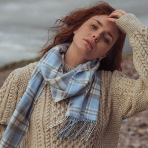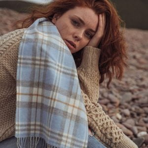 Lambswool Cape Blue Green Orange Check. Soft, warm and effortlessly stylish, the John Hanly Lambswool Cape is a versatile layer for any season. Woven from 100% pure lambswool in our Tipperary mill, it combines cosy comfort with a contemporary drape. Designed in a one-size-fits-all silhouette, it flatters every shape and adds an elegant finish to both casual and dressy looks. The popular Sue style comes without a fringe for a clean, modern edge, while the rich checks and colours bring timeless Irish charm to your wardrobe.