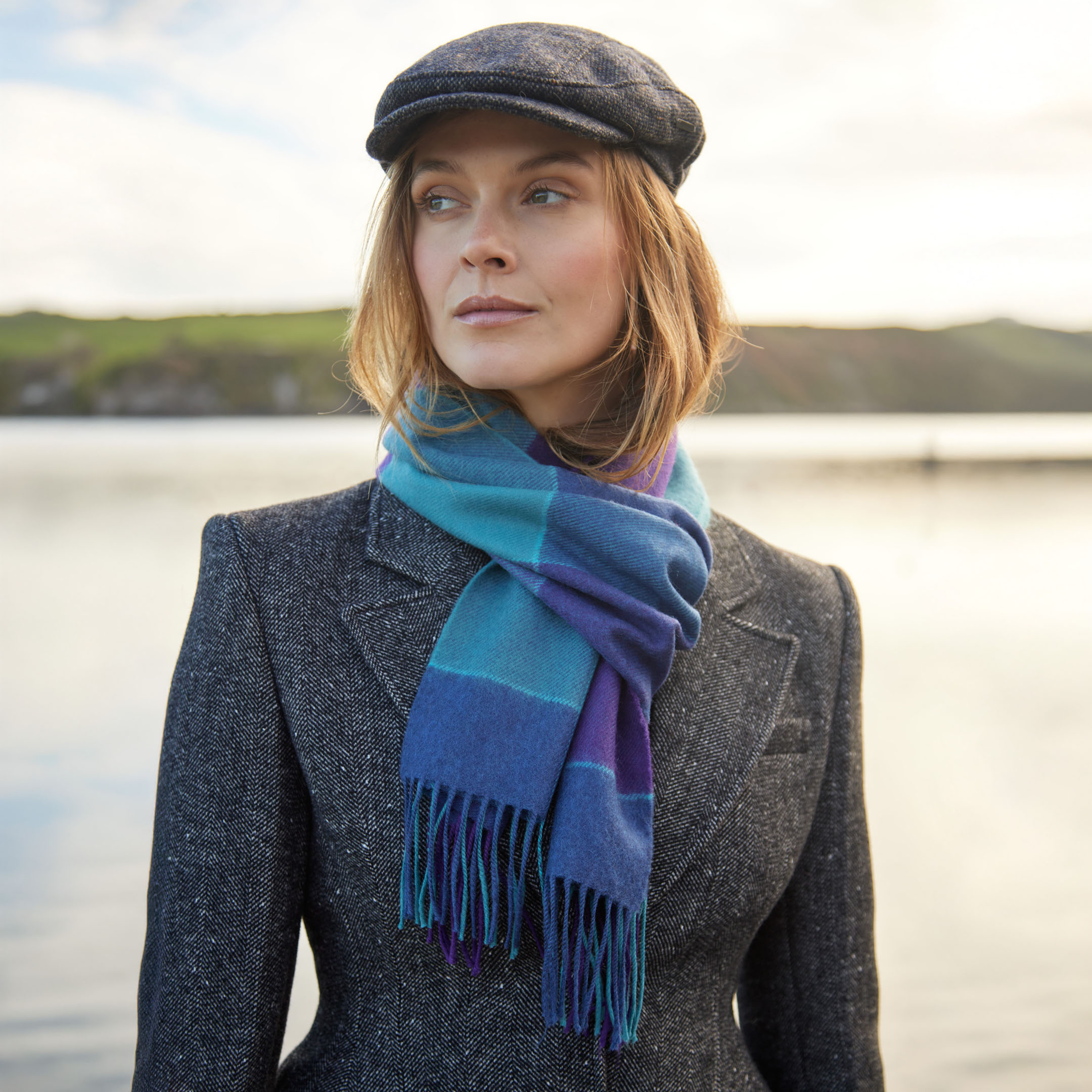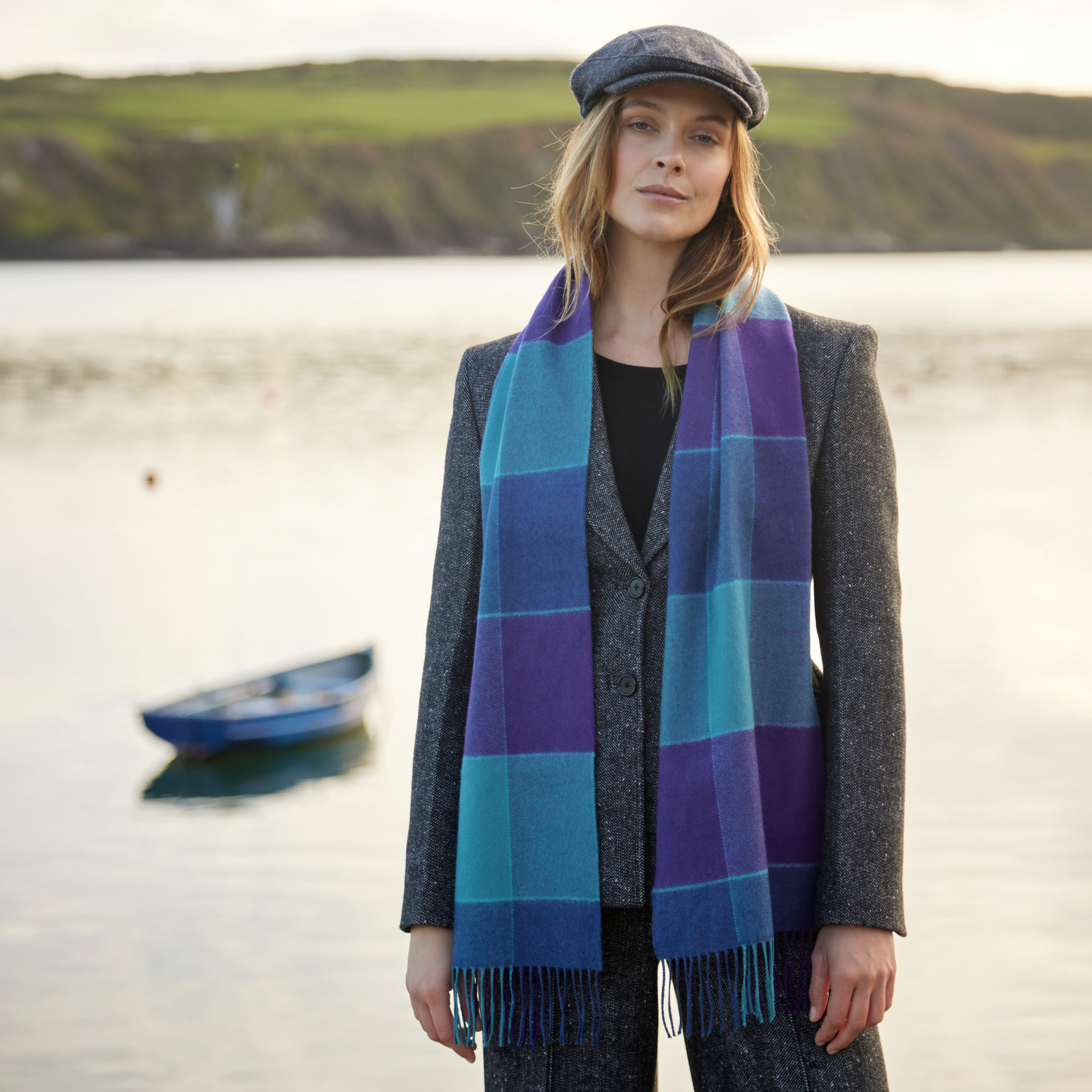 Merino Luxury Wool Scarf Blue Purple Mix Block Check. A vibrant and stylish collection that provides a beautiful mix of colours, patterns and is incredibly soft to the touch. 100% Fine Merino Brushed Wool.