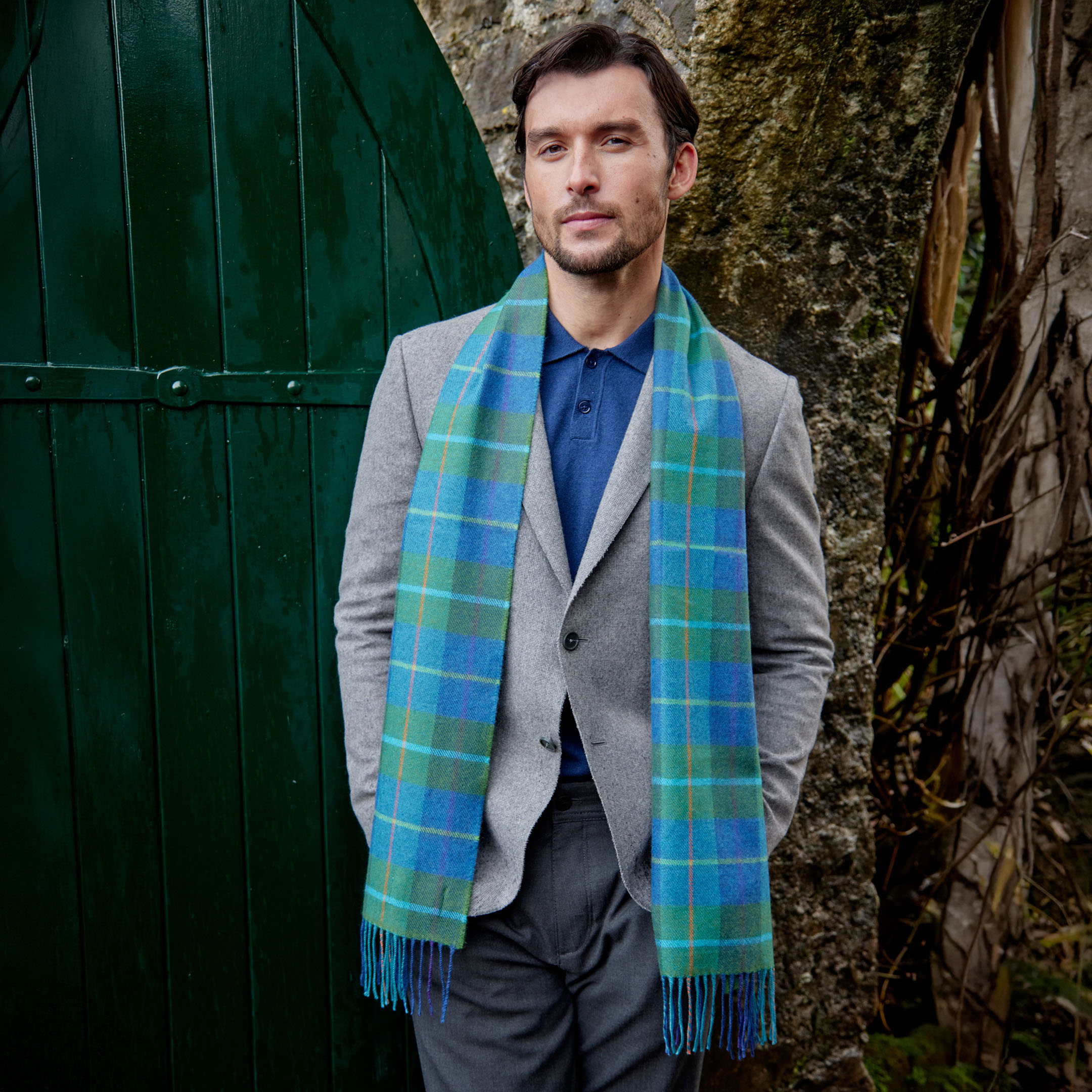 Merino Luxury Wool Scarf Denim Green Check. A vibrant and stylish collection that provides a beautiful mix of colours, patterns and is incredibly soft to the touch. 100% Fine Merino Brushed Wool.
