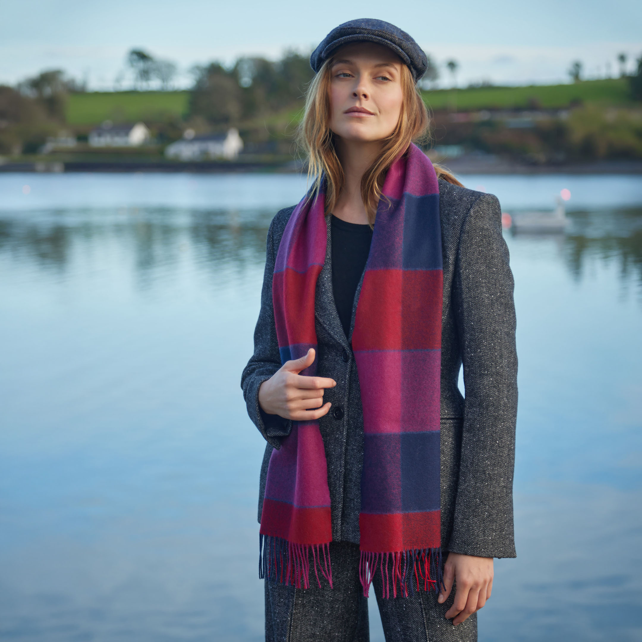 Merino Luxury Wool Scarf Red Pink & Navy Block Check. A vibrant and stylish collection that provides a beautiful mix of colours, patterns and is incredibly soft to the touch. 100% Fine Merino Brushed Wool.