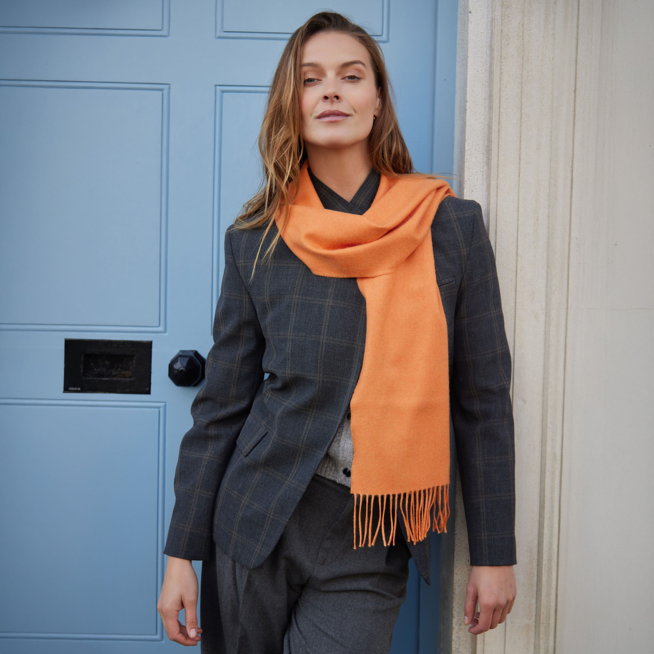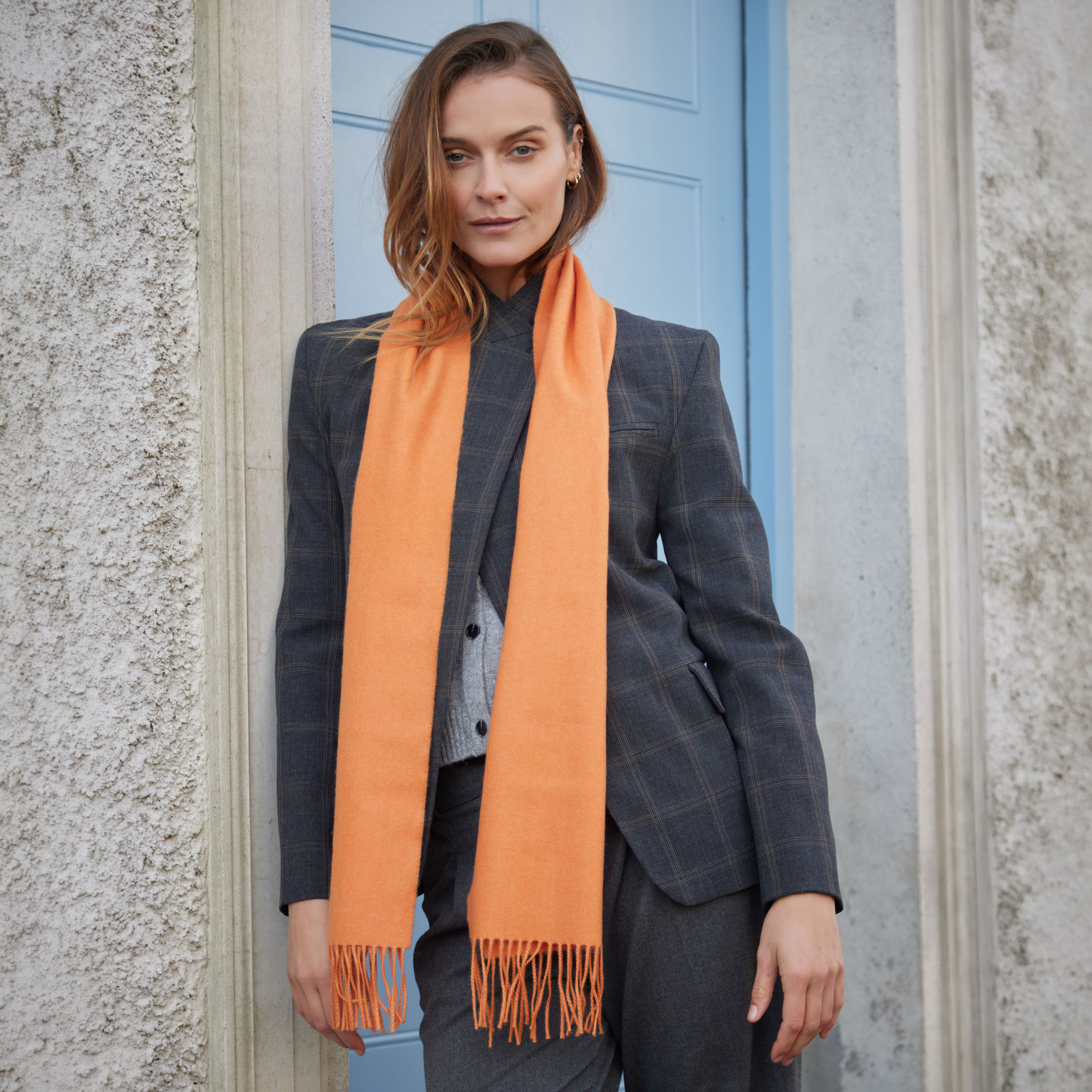 Merino Luxury Wool Scarf Tangerine. A vibrant and stylish collection that provides a beautiful mix of colours, patterns and is incredibly soft to the touch. 100% Fine Merino Brushed Wool.