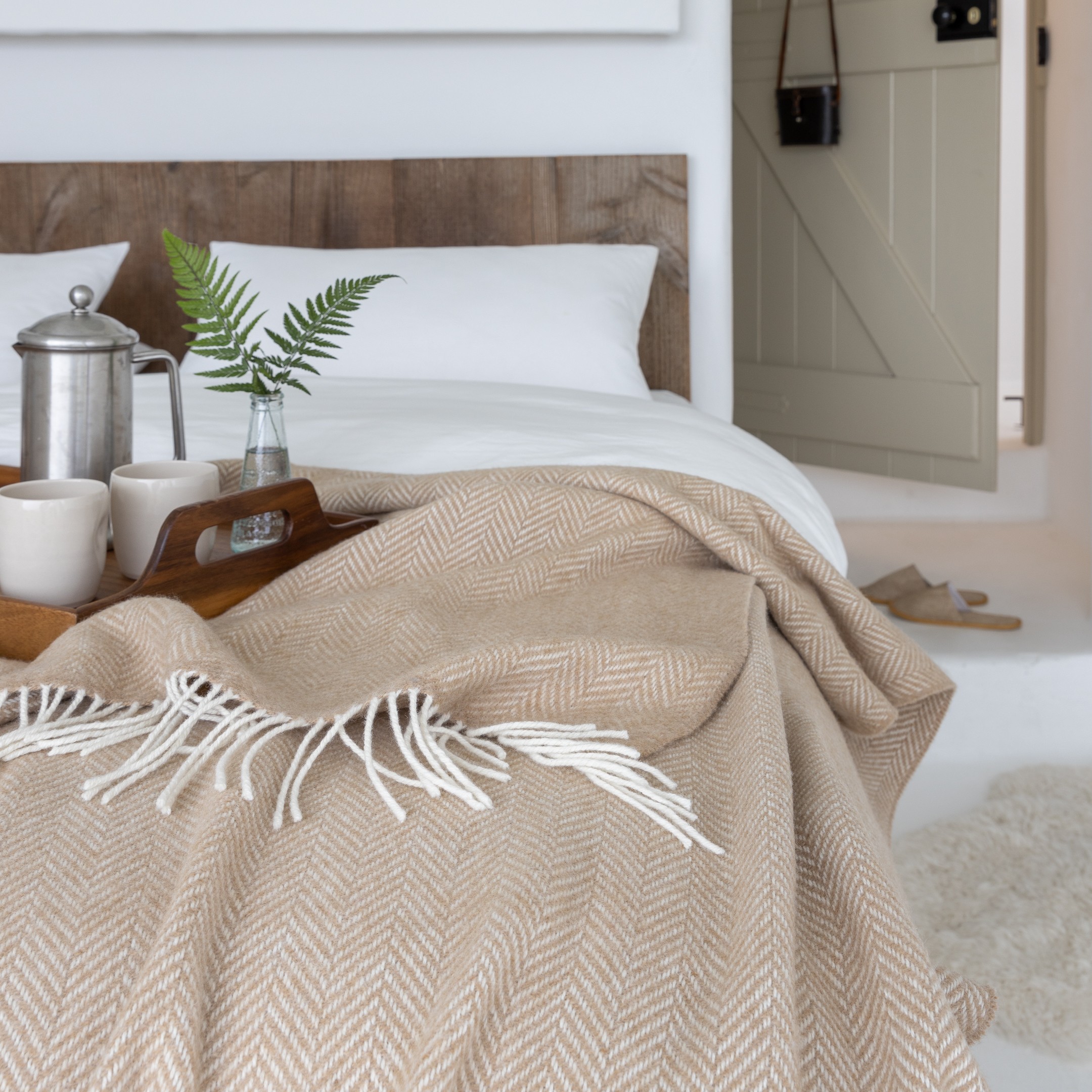 Oversized Merino Wool Cashmere Throw Beige Herringbone. Crafted from a luxurious blend of 95% Merino Wool and 5% Cashmere, our Oversized Throws combine exceptional softness, warmth, and style. Featuring a uniquely long herringbone pattern in a range of vibrant colours, they are generously sized to add comfort and elegance to any space – perfect for draping across a bed, styling over a sofa, or wrapping up in for cosy moments.