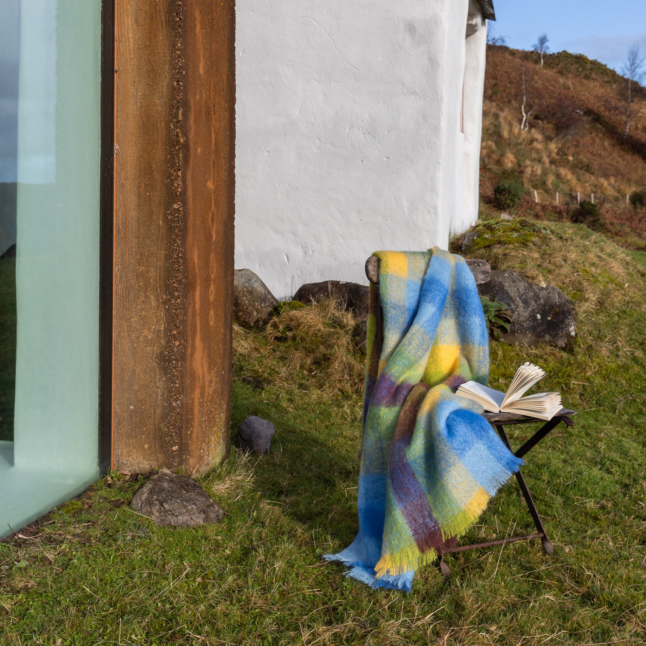 Mohair Throw Blue Yellow Lime Brown Blocks. Add warmth, texture, and timeless style to your home with our luxurious Mohair Throw. Expertly woven from a blend of 70% Mohair and 30% Wool, this throw is naturally lightweight yet exceptionally warm, making it the perfect companion for cosy evenings. Its soft, voluminous texture and gentle sheen bring elegance to any setting, whether draped across a sofa, layered on a bed, or casually placed over a chair for a pop of colour. Versatile and effortlessly stylish, the Mohair Throw is more than just a blanket — it’s a statement piece that transforms your living space with comfort and character.