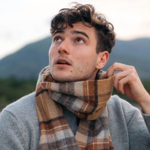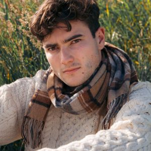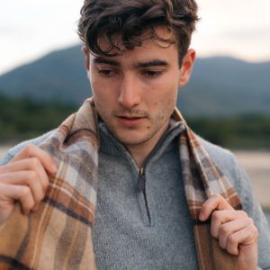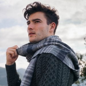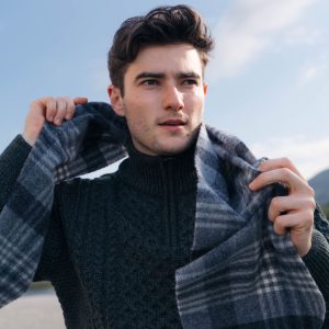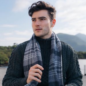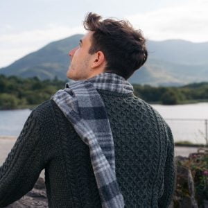 Irish Wool Scarf Long Grey Charcoal Silver Block Check